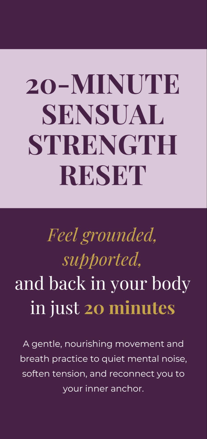 This free 20-minute Sensual Strength Reset is a guided, embodied practice that blends breath, gentle strength, and fluid movement to help you: